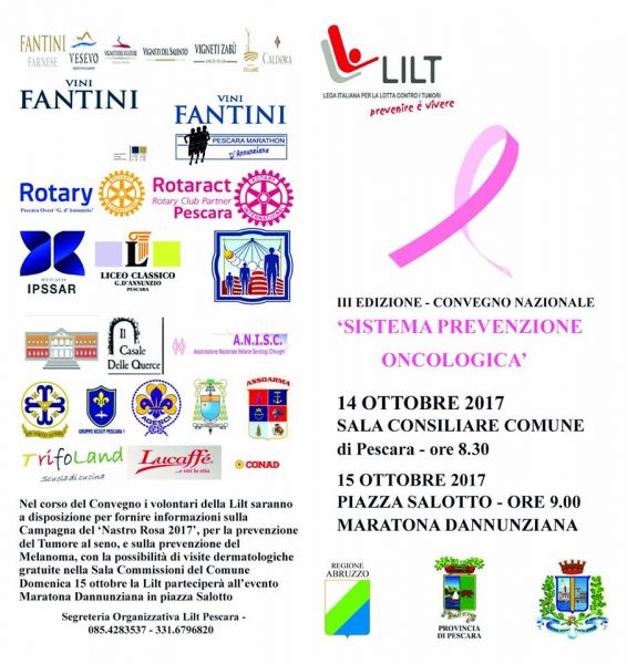 PESCARA – Sabato , 14 ottobre 2017, nella Sala Consiliare del Comune di Pescara, a partire dalle ore 8.30 si terrà la III Edizione del Convegno Nazionale ‘Sistema Prevenzione Oncologica’ promosso dalla Lilt – Lega Italiana Lotta ai Tumori – Sezione di Pescara.