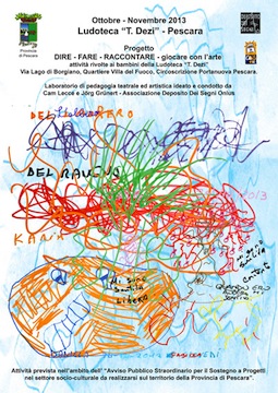 PESCARA – Al via le attività del progetto “DIRE FARE RACCONTARE giocare con l’arte” presso la ludoteca “T. Dezi” di Pescara, sita in Via Lago di Borgiano a Rancitelli, nel Quartiere Villa del Fuoco della circoscrizione Portanuova di Pescara.Le attività, iniziate il 22 ottobre si concluderanno il 21 novembre 2013, rientrano nel progetto della Provincia di Pescara: “Avviso Pubblico Straordinario per il Sostegno a Progetti nel settore socio-culturale da realizzarsi sul territorio della Provincia di Pescara”, e sono ideate e condotte da Cam Lecce e Jörg Grünert dell’Associazione Deposito Dei Segni Onlus, in collaborazione con il Ceis di Pescara.