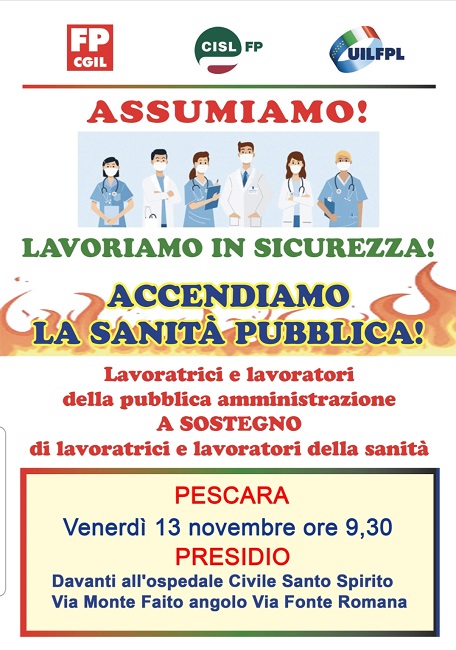 “Pubblico per il pubblico, lavoratori uniti per dare cure e servizi ai cittadini”. Questo lo slogan dell’iniziativa, promossa da Fp Cgil, Cisl Fp Abruzzo Molise e Uil Fpl Abruzzo, che si svolgerà venerdì 13 novembre a partire dalle ore 10,00 alle ore 12.00 presso l’Ospedale Civile di Pescara, a cui parteciperanno i lavoratori del pubblico impiego, in segno di solidarietà verso il personale sanitario che sta affrontando in prima linea questa emergenza pandemica, per rivendicare il diritto a lavorare in sicurezza, il rinnovo dei contratti e nuove assunzioni.
