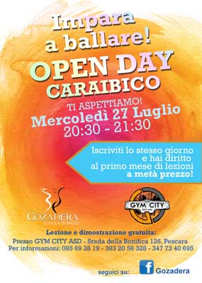 PESCARA – Open day caraibico promosso dalla scuola di ballo Gozadera e dal centro sportivo Gym City ASD di Pescara. L’evento si tiene nei locali della Gym City mercoledì 27 luglio dalle 20:30 alle 21:30.