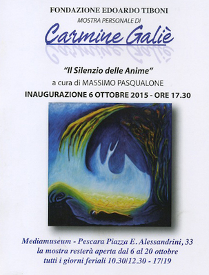 Il critico Massimo Pasqualone afferma che Carmine Galiè è una delle voci più autorevoli dell’introspezione artistica in Abruzzo e con questa mostra presenta al pubblico una indagine precipua e raffinata dei grandi temi della vita. La mostra, ad ingresso libero è visitabile tutti i giorni feriali dalle ore 10,30 alle 12,30 e dalle 17,00 alle 19,00, terminerà il 20 ottobre 2015.