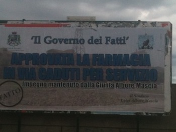 In questo quadro di desolante disprezzo della democrazia fa da cornice anche il puerile attivismo del Sindaco Mascia che, non avendo di che comunicare del proprio operato, affigge manifesti per annunciare che in Via Caduti per Servizio – diversamente da quanto deliberato dal Consiglio comunale che ha indicato specificatamente Zona Fontanelle – vi sarà una nuova farmacia che risulta essere il frutto delle scelte operate dal Governo Monti.