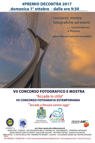 PESCARA – Oggi,domenica 1 ottobre a Pescara presso il mercato coperto di piazza Muzii si terrà la settima edizione del Premio Decontra, un evento fotografico e artistico. Dalle ore 9.30 fino a tardo pomeriggio saranno esposte in mostra le foto premiate, segnalate ed ammesse al concorso nazionale con patrocinio Uif (Unione Italiana Fotoamatori) in collaborazione con il Gruppo Fotografico La Genziana di Pescara. In serata ci sarà la premiazione dei concorrenti.