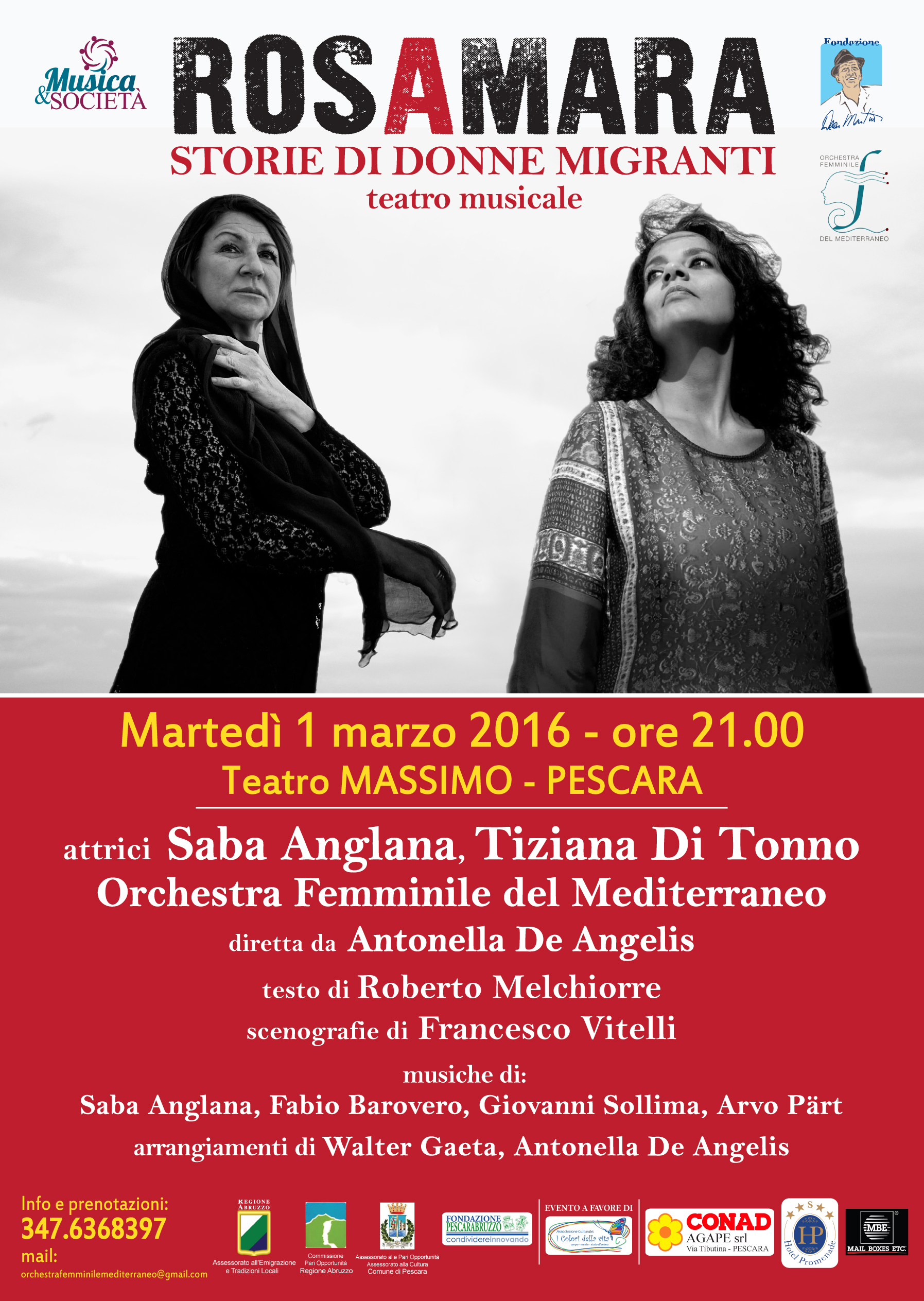 PESCARA – In occasione della Giornata Internazionale dei Diritti del Migrante Musica e Società, con il patrocinio dell’Assessore all’Emigrazione della Regione Abruzzo Donato Di Matteo, dell’assessore alle Pari Opportunità e Migranti del Comune di Pescara Sandra Santavenere, della presidente della Commissione Pari Opportunità della Regione Abruzzo Gemma Andreini, della Fondazione Dean Martin e dell’OFM, ha presentato lo spettacolo di teatro musicale Rosamara – Storie di donne migranti, in programma martedì 1° marzo alle ore 21 al Teatro Massimo, con l’attrice e cantante internazionale Saba Anglana, impegnata in prima linea sulle questioni dell’immigrazione, la pescarese Tiziana Di Tonno e l’Orchestra Femminile del Mediterraneo, diretta da Antonella De Angelis.