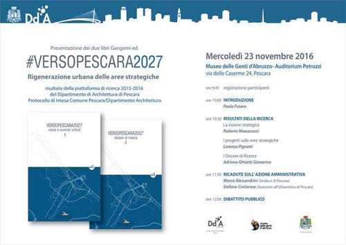 PESCARA – Mercoledì 23 novembre 2016, alle ore 9.45, presso l’Auditorium Petruzzi, a Pescara, si terrà la presentazione dei due volumi “Verso PESCARA 2027. Rigenerazione urbana delle aree strategiche”, edizione Gangemi.