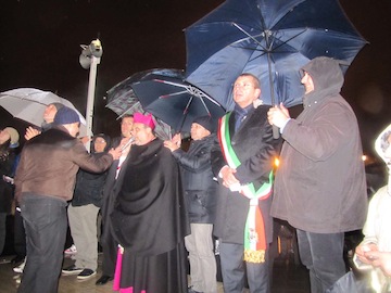 neanche il vento freddo, le temperature polari e la pioggia sono riusciti a fermare, nella serata di ieri, giorno dell’Immacolata, la processione dei fedeli che, guidati dall’arcivescovo di Pescara, Monsignor Tommaso Valentinetti, sfidando le intemperie, hanno comunque voluto portare il proprio omaggio floreale alla Madonnina del Porto, un’iniziativa tradizionalmente svolta nella mattinata dell’8 dicembre e quest’anno slittata a sera per promuovere una sorta di fiaccolata e per consentire, al mattino, la concomitante cerimonia di consacrazione di Pescara al Cuore Immacolato di Maria. Decine di persone ieri sera, hanno comunque partecipato al corteo per assistere al rito dei Vigili del Fuoco che, con l’aiuto di una gru-motoscala, hanno lasciato la corona di fiori gialli e rosa sulla statua per ricordare la professione di fede dell’intera Pescara. Un momento di forte coinvolgimento emotivo al quale le Istituzioni hanno partecipato con forza e convinzione.