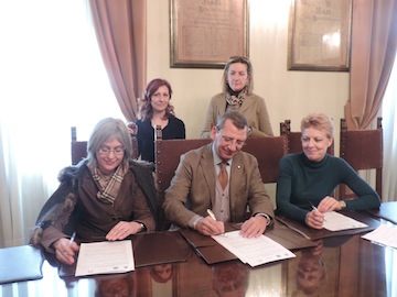 “Ritengo – ha sottolineato il sindaco Albore Mascia – che quello odierno sia un ottimo esempio di collaborazione interistituzionale, certamente non il primo attuato dalla nostra amministrazione di governo, che vede Pubblica amministrazione e mondo della scuola lavorare insieme, in strettissima sinergia, mettendo al centro della nostra progettualità, innanzitutto, i nostri ragazzi, gli studenti, ai quali offriamo l’occasione di un’applicazione concreta, visibile, tangibile del proprio sapere, di quelle tecniche teoriche apprese sui banchi e che comunque un giorno dovranno trasformare in ‘mestiere’, in professione. E con i nostri studenti la nostra amministrazione ha già promosso diversi progetti: penso, ad esempio, agli stage studio-lavoro all’interno dei nostri uffici; penso al progetto, per ora in fase organizzativa, per la riqualificazione del muraglione che costeggia l’Istituto Acerbo, dinanzi alla Ferrovia, attraverso la realizzazione di un murales che sarà affidato interamente ai ragazzi. Ma veniamo all’iniziativa odierna: tutto parte dalla chiara ed espressa volontà del Comune di Pescara di garantire ogni possibile intervento per tutelare e conservare il nostro patrimonio storico e artistico, un patrimonio che conta due opere d’arte di grande valore. L’Aurum ospita infatti al piano terra la sede dell’Archivio di Stato, e proprio alcuni locali oggi adibiti a tale funzione hanno il privilegio di accogliere due realizzazioni artistiche permanenti di livello internazionale, ossia l’opera murale ‘Glamour’, realizzata dall’artista ginevrina Fleury Sylvie, e l’opera murale, ‘Paesaggio con Alberi’, realizzata dall’artista Julian Opie, con la tecnica dell’affresco. Entrambe le opere sono state realizzate in occasione della rassegna internazionale di arte, architettura, fotografia e teatro ‘Fuori Uso’, edizione 1995, promossa dal gallerista Cesare Manzo. Due opere dunque che in 19 anni di vita e di storia non hanno avuto forse tutta l’attenzione che avrebbero meritato, ma che oggi intendiamo recuperare restituendo loro tutta la dignità e la straordinarietà espressiva con le quali sono state concepite. Partiremo con il recupero del ‘Paesaggio con Alberi’, un grandioso e luminoso trompe l’oeil, con forme geometriche e volumetriche controllate, tipiche di Julian Opie che oggi è di fatto uno dei massimi esponenti della New British Sculture. L’opera, così come ‘Glamour’, ha bisogno di un importante intervento di restauro: parliamo di un murale di 7,10 metri per 3,20 metri, dunque occupa un’intera parete e sembra che negli anni, circostanza che stiamo ricostruendo, abbia già subito un intervento di integrazione pittorica, specie nella zona del cielo, dove gli esperti hanno rintracciato uno strato di colore non originale. Purtroppo oggi a minare il murale è un problema di umidità, di infiltrazione, che ha provocato il sollevamento e distacco di alcune parti disegnate, con relativa caduta del colore. Inoltre la stessa parete presenta, nella zona centrale del dipinto, una lunga lesione trasversale che probabilmente si è creata a causa di movimenti strutturali del complesso architettonico stesso. Non solo: la pellicola pittorica appare offuscata da uno strato consistente composto da depositi atmosferici ed è interessata da abrasioni e graffi, ma la parte più compromessa risulta essere in corrispondenza dell’albero. Oggi il Comune andrà a recuperare l’opera con un intervento restaurativo e conservativo, che verrà materialmente finanziato dall’amministrazione comunale, tramite l’acquisto e la fornitura dei materiali necessari, mentre a realizzare materialmente l’intervento, all’interno dei propri percorsi laboratoriali-didattici, saranno, come abbiamo previsto nel Protocollo d’intesa che oggi firmiamo, gli studenti dell’Istituto ‘Misticoni-Bellisario’, come da progetto redatto dalla professoressa Annalisa Clerico. In questo accordo – ha detto il sindaco Albore Mascia – si inserisce l’Archivio di Stato che dovrà mettere a disposizione dei ragazzi i locali, secondo orari e modalità che poi verranno concordati con la stessa scuola, e soprattutto dovrà in qualche modo coordinare tale intervento, dando anche la disponibilità delle proprie professionalità. L’intervento di restauro prevede, sostanzialmente, il consolidamento dei distacchi dell’intonaco attraverso iniezioni di malte naturali, mentre il fissaggio del film pittorico avverrà con l’utilizzo di resine acriliche, con la rimozione dei depositi superficiali di polvere con spugne e acqua deionizzata. Infine si realizzeranno le integrazioni cromatiche, nelle parti in cui possono essere ricostruite, per restituire all’opera la sua originale forza e impatto di colore. Ovviamente a opera conclusa l’amministrazione comunale, con l’Archivio di Stato e l’Istituto Misticoni, organizzerà un’iniziativa di presentazione aperta alla città. Nel mentre che partiremo con la prima opera, stiamo cercando risorse per provvedere anche al restauro dell’opera ‘Glamour’, il secondo murale, che, anch’esso, presenta problemi di umidità, ma richiede un investimento di risorse maggiore per la sua restituzione al pubblico”.