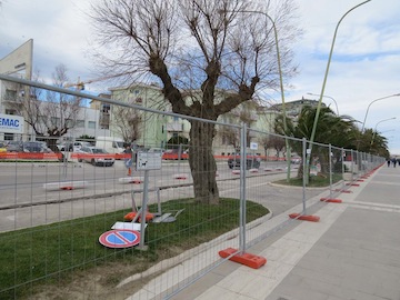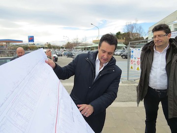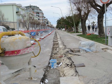 ta ciclabile a due corsie di marcia. I lavori comporteranno la demolizione dell’attuale cordolo in travertino per permettere l’allargamento della sede del marciapiede, quindi il rifacimento dei tratti in tappetino d’asfalto, la creazione di piazzole degli autobus con il conseguente spostamento di circa 2metri lato monte delle pensiline attualmente esistenti e la tinteggiatura della pista ciclabile, proprio per diversificarla e distinguerla dal marciapiede pedonale, com’è già accaduto a nord e a sud. Il nuovo assetto della riviera, partendo dal marciapiede lato monte, sarà costituito da un parcheggio per i motocicli con una sezione variabile sino a un massimo di 1 metro; la carreggiata stradale larga 2,75 metri; la carreggiata stradale per gli autobus larga 3,50 metri; e il parcheggio per i veicoli in linea largo 1,80 metri. Già predisposto anche l’abbattimento delle barriere architettoniche – ha aggiunto l’assessore Fiorilli -, ovvero l’allargamento dei marciapiedi sarà realizzato in piano in modo da consentirne la fruizione anche alle persone costrette in carrozzella e sono previsti attraversamenti pedonali provvisti di scivoli di invito idonei al superamento del dislivello del marciapiede anche attraverso carrozzelle o da persone disabili. Il progetto è già stato approvato anche dalla Sovrintendenza per i Beni architettonici e paesaggistici per l’Abruzzo e lo scorso luglio siamo arrivati all’aggiudicazione del cantiere. Dieci le ditte invitate alla gara d’appalto per un importo base pari a 130mila euro; solo in quattro hanno presentato l’offerta al massimo ribasso, e alla fine i lavori sono stati aggiudicati all’impresa Fratelli Bucci della provincia di Teramo per 71mila 973,71 euro di cui 67mila 865,29 per i lavori e 4mila 108,42 euro per la sicurezza, con un ribasso pari al 27,681 per cento. Chiusa positivamente anche la verifica dei requisiti, stamane il cantiere è stato ufficialmente aperto: ovviamente per consentire lo svolgimento dei lavori abbiamo istituito il divieto di sosta e di fermata, per occupazione della sede stradale, sul lato mare del lungomare Matteotti, nel tratto compreso tra la Madonnina e la Nave di Cascella, provvedimento che resterà in vigore sino alle 24 del prossimo 3 marzo, lavori dunque che andranno avanti per 45 giorni, restituendo alla città parcheggi e pista ciclabile prima dell’arrivo della primavera”.
