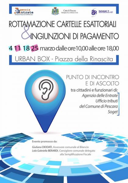 PESCARA – Sabato 11 marzo 2017 sarà novamente aperto il Punto di informazione e di Ascolto dedicato alla rottamazione delle cartelle esattoriali, istituito dall’Amministrazione comunale di Pescara in Piazza della Rinascita, negli spazi dell’Urban Box.