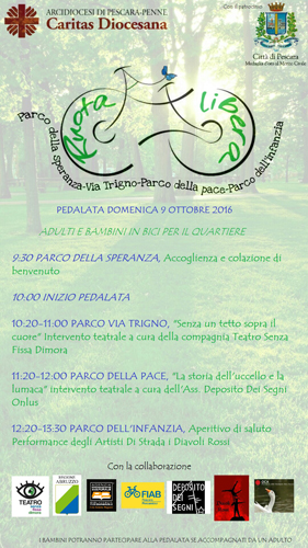 I parchi interessati dalla “pedalata” saranno:il Parco della Speranza (Via Lago di Capestrano), il Parco di Via Trigno, il Parco della Pace (Via Aterno) e, dulcis in fundo, il Parco dell’Infanzia (Via Tavo).