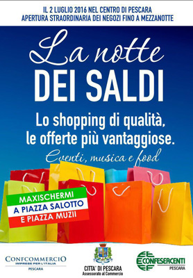 PESCARA – Tutto pronto per la Notte azzurra dei saldi che prenderà vita oggi, sabato 2 luglio dalle 19 in poi. Una notte di acquisti ed affari commerciali, che nasce in sinergia con Confcommercio e Confesercenti, ma anche di tifo, perché sarà possibile vedere la partita per strada in due maxi schermi allestiti appositamente per Italia-Germania, ce n’è uno in piazza della Rinascita e uno anche in piazza Muzii a questi si aggiungono tre schermi su via Cesare Batt