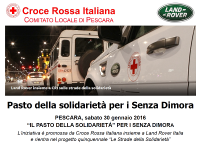 PESCARA – A due anni esatti dall’avvio del progetto “Le Strade della Solidarietà”, che si prefigge di sostenere i più bisognosi nei contesti metropolitani, Land Rover Italia e Croce Rossa Italiana organizzano, per la prima volta insieme, il “Pasto della Solidarietà”, che si terrà sabato 30 gennaio in 24 città sul territorio nazionale.
