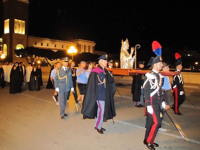 Ma a seguire la statua del Santo, portata a spalla dagli scout con la scorta dei Carabinieri in alta uniforme, sono state, come ogni anno, centinaia di persone riunite in un silenzioso raccoglimento, scandito solo dalla preghiera. Il corteo religioso, guidato dallo stesso Arcivescovo Valentinetti, lasciata la cattedrale, ha attraversato via Gabriele D’Annunzio, il Ponte D’Annunzio, per poi snodarsi lungo via Caduta del Forte, corso Vittorio Emanuele, il Ponte Risorgimento, via Marconi, via Conte di Ruvo e di nuovo via Gabriele D’Annunzio con rientro in cattedrale tra due ali di folla.