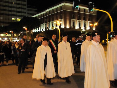 PESCARA – Un momento di profonda riflessione su una celebrazione che affonda le proprie radici nella storia della città così il sindaco Albore Mascia ha definito la tradizionale processione della festa di San Cetteo, Patrono di Pescara , che si è svolta ieri. Dopo la celebrazione della Santa Messa, officiata a partire dalle 18, dall’arcivescovo di Pescara-Penne, Monsignor Tommaso Valentinetti, alle 19 è partito il corteo religioso, seguito dalle autorità cittadine, ossia oltre al sindaco di Pescara Luigi Albore Mascia, anche il Presidente della Provincia Guerino Testa, il vicepresidente vicario del Consiglio comunale Gianni Santilli, l’onorevole Antonio Razzi e il consigliere delegato all’Igiene Urbana Armando Foschi, oltre alle Autorità militari.