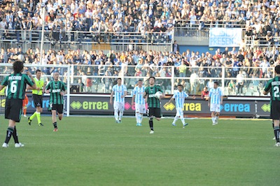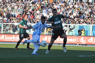 CICLONE IMMOBILE, SASSUOLO STESO IN 10 – La ripresa si apre subito con l’episodio che cambia il volto all’incontro, regalando così emozioni a non finire per tutto il tempo: al 4′ su cross preciso di interno destro di Insigne tocco di mano di Bianco in area di rigore nel tentativo di evitare il gol. Cartellino rosso e rigore per il Pescara. Dal dischetto Immobile calcia angolato alla sinistra di Pomini che aveva intuito la traiettoria facendo esplodere di gioia il numeroso pubblico presente sugli spalti.