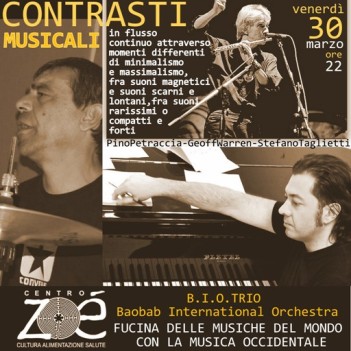 PESCARA – Venerdì 30 Marzo, alle ore 22, al Centro Zoé, in Via Colle Innamorati 59, a Pescara, secondo appuntamento con B.I.O. TRIO, una costola della più grande e complessa BAOBAB International Orchestra. Il tema del concerto è CONSTRASTI. Le musiche presentate, sempre nella forma di un flusso continuo, senza soluzioni di continuità, attraverseranno molti momenti differenti, percorsi fra minimalismo e massimalismo, fra suoni magnetici e suoni scarni e lontani fra suoni rarissimi o compatti e forti. Bio trio seguirà’ sempre quella grande fucina delle musiche ascoltate nel mondo con la musica occidentale .