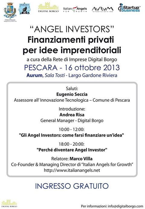 L’evento che si svolgerà mercoledì, 16 ottobre – ha spiegato Andrea Risa – sarà l’occasione per cercare di dare un impulso alla creazione di un ecosistema composto da azienda in start up, imprenditori o persone che vogliono diventare imprenditori, e i possibili finanziatori di uno start up. Digital Borgo ha già intrapreso in tal senso alcuni discorsi e una programmazione di eventi che permettono di conoscere i possibili metodi: abbiamo cominciato lo scorso luglio con un seminario teso a illustrare ‘come si presenta un’idea’; ora punteremo a spiegare come si presenta un evento agli Angel Investor, gruppi di privati che si associano per investire sulla nascita di una piccola attività imprenditoriale e che si riuniscono sotto il gruppo dello Iag, Italian Angel for Growth, che ha sede a Milano, e mercoledì con noi avremo Marco Villa, Direttore generale del gruppo. L’evento si svilupperà in due sessioni: al mattino, dalle 10 alle 12, rivolto alle aziende e agli imprenditori, su ‘Come farsi finanziare un’idea’; la sera, dalle 18 alle 20, ci focalizzeremo sulle persone che hanno un capitale potenziale da investire nello start up, ossia ‘Perché diventare Angel Investor’. A oggi in Abruzzo non abbiamo imprenditori che facciano parte dello Iag e dunque l’appuntamento di mercoledì sarà una sorta di scommessa al fine di creare un pool. A tal fine abbiamo rivolto un invito a partecipare a tutte le Associazioni di categoria della città, anche a quelle no-profit, oltre che a singoli imprenditori portatori di un potenziale interesse.