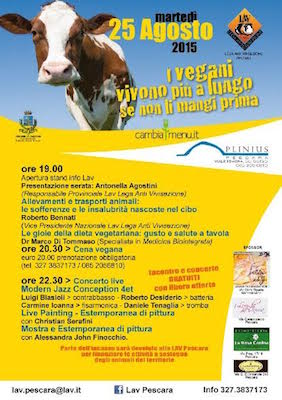 La serata proseguirà con una cena vegana (20 euro da prenotare) e con il concerto live di Modern Jazz Conception 4et (Luigi Blasioli al contrabbasso, Roberto Desiderio alla batteria, Carmine Ioanna alla fisarmonica, Daniele Tenaglia alla tromba). Il tutto sarà colorato ed arricchito dalla mostra ed estemporanea di pittura degli artisti Alessandra John Finocchio e Christian Serafini. Sarà una bellissima serata di informazione e festa, da trascorrere insieme in allegria. Presso il desk informativo della Lav sarà possibile ritirare materiale informativo, ricettari veg, firmare le petizioni animaliste della Lav, compresa la nuovissima indirizzata al Parlamento Europeo per chiedere la messa al bando dei test animali sui prodotti per la pulizia della casa. Ci si potrà iscrivere all’Associazione per dare il proprio contributo fattivo per la difesa dei diritti degli animali e conoscere da vicino il LAVoro svolto sul territorio dalla Lav Pescara.
