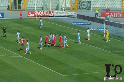 Al 21′ su un disimpegno errato di Angelo bello scambio dei biancazzurri con Ragusa, che pesca in area di Bovo il quale si fa chiudere in angolo al momento della conclusione sotto porta. Tre minuti dopo uno spunto in area di Scapuzzi la palla carambola sui piedi di Pulzetti che calcia di destro ,ma alza troppo la mira da posizione centrale. Nel finale di tempo due azioni degne di nota: al 41′ bello spunto sulla destra di Pulzetti che supera in velocità un paio di avversari e la mette forte al centro rasoterra ,ma nessun compagno è pronto a chiudere in rete ed allo scadere conclusione da fuori area di Rosina che sfiora il palo alla sinistra di Pelizzoli.