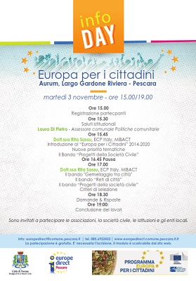 PESCARA – Il Programma Europa per i Cittadini 2014-2020 mira ad avvicinare i cittadini europei all’Unione Europea, proponendosi di colmare la distanza, fra la comunità e chi la rappresenta. Lo Europe Direct del Comune di Pescara organizza, in collaborazione con lo Europe for Citizens Point – MiBACT, un Infoday dedicato al Programma che si svolgerà all’Aurum martedì 3 novembre dalle ore 15 in poi con la partecipazione della dottoressa Rita Sassu, dell’ECP, Europe for Citizens Point Italy, MiBact che terrà due sessioni dedicate alla cittadinanza europea attiva e alle città europee.