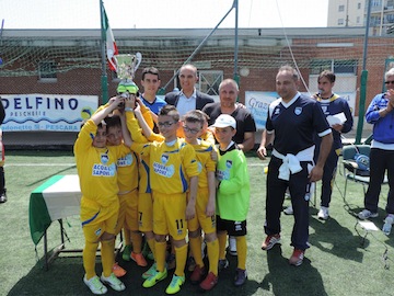 PESCARA – Si sono svolte ieri mattina, presso il Campo sportivo San Marco a Pescara, le premiazioni del Torneo ‘Il Delfino’ , organizzato ogni anno dalla Famiglia Paluzzi, con la Società Asd ‘Il Delfino Flacco-Porto Il Pescara’ e che per l’edizione 2014 ha visto la partecipazione di 25 Società sportive, di Pescara, della sua provincia, e di Chieti. Per tre giorni i bambini della classe 2003, 2004 e 2005, 450 ragazzi in tutto, si sono sfidati sul campo dell’impianto sportivo San Marco, per arrivare alla finalissima di ieri di Champion’s League, Coppa League e Coppa Italia, sotto la guida dell’organizzatore, il professor Giancarmine Chiacchiaretta e del presidente de Il Delfino Luciano Zangirolami.
