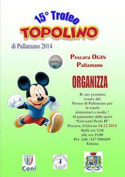 PESCARA – É convocata per oggi, venerdì 12 dicembre, alle ore 11, nella Sala Giunta del Comune di Pescara, la conferenza stampa di presentazione di un appuntamento con la pallamano per i più piccoli. Si tratta del Trofeo Topolino, evento giunto alla sua VI edizione, che si svolgerà il 14 dicembre al Palazzetto dello sport Giovanni Paolo II.Alla conferenza parteciperanno l’assessore allo Sport Giuliano Diodati, oltre agli organizzatori dell’evento.