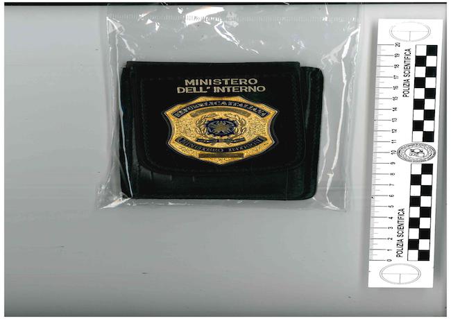Il capo pattuglia ha deciso di procedere con una perquisizione sia sul veicolo e sia sulla persona ed ha trovato in un vano portaoggetti, accanto alla leva del cambio, un taglierino e delle forbici. Da un marsupio è saltato fuori un porta tesserino simile a quelli in uso alle forze dell’ordine con una placca in metallo dorato con uno stemma della Repubblica Italiana e un tesserino con una foto dell’uomo con una matricola ed una scritta riferita a “Servizi integrati di sicurezza” con il grado di Ispettore.