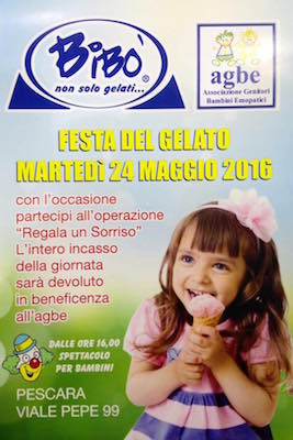 PESCARA – Si rinnova domani pomeriggio, 24 maggio a Pescara, nella gelateria Bibò di via Pepe, a Pescara, il tradizionale appuntamento con la solidarietà voluto dai gestori del locale, associato alla Cna di Pescara con l’Associazione Genitori Bambini Emopatici di Pescara, l’Agbe.