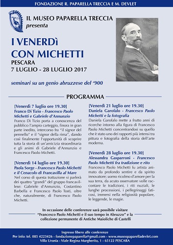 Per iniziativa del Vice Presidente della Fondazione Paparella Treccia, Avv. Alberto Massignani, sono state organizzate per il 7-14-21-28 luglio c.a. quattro conferenze incentrate sui vari aspetti dell’opera e della vita del grande artista abruzzese Francesco Paolo Michetti.