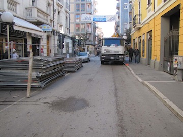 Allestimento del cantiere in via Cesare Battisti i cui lavori dovranno finire a marzo