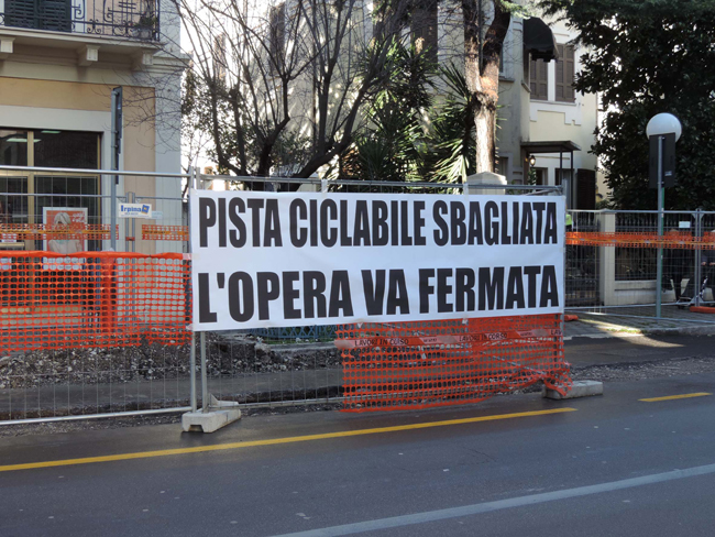 La pista sarà infatti adiacente al marciapiede lato monte, occupando tutto lo spazio oggi riservato alla sosta, quindi verranno cancellate decine di parcheggi, che sono vitali in una zona ad alta intensità di traffico veicolare e in cui si concentrano 14 negozi di vicinato storici, che pure cercano di resistere alla crisi che sta svuotando il ‘centro commerciale naturale’. Tolti quei posti auto, sarà impossibile per chiunque fermarsi sull’asse per fare i propri acquisti, decretando la morte di quelle attività familiari.