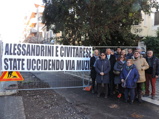 “Già dalle prime ore del mattino – ha detto il Capogruppo di Forza Italia Antonelli – sulla recinzione rossa del cantiere sono stati affissi tre banner con gli slogan che accompagneranno la nostra protesta e che racchiudono il senso dell’iniziativa”, ossia ‘-Parcheggi, +pista ciclabile, la morte di via Muzii’, ‘Pista ciclabile sbagliata, l’opera va fermata’, e infine ‘Alessandrini e Civitarese, state uccidendo via Muzii’.