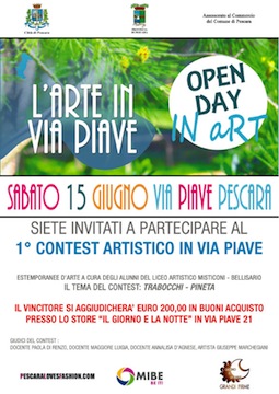 PESCARA – Oggi, 15 giugno, dalle ore 11 alle ore 19, in via Piave, a Pescara, saranno allestite mostre ed estemporanee artistiche a cura dei ragazzi del liceo di istruzione superiore MiBe (Misticoni Bellisario). E’ l’iniziativa, denominata “Open day in Art”, ideata e realizzata dall’associazione culturale “Pescara lei events”, presieduta da Ilenia Colasante, in collaborazione con il Liceo artistico Mibe di Pescara, con il patrocinio della Provincia e del Comune di Pescara (Assessorato al Commercio) e con il supporto dello store “Il giorno e la notte”, che si trova proprio in via Piave, a Pescara.