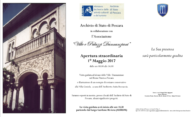 PESCARA – L’Archivio di Stato di Pescara, diretto dalla dott.ssa Carmela di Giovannantonio, in collaborazione con l’Associazione Ville e Palazzi Dannunziani, promuove, in occasione dell’apertura straordinaria del 1° maggio 2017 disposta dal MiBACT , una visita guidata alle Ville Dannunziane nel Rione Pineta a Pescara.