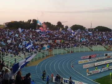 FESTA SUGLI SPALTI – Alla mezzora gli ospiti protestano per una rete annullata, ma c’era tutta la carica al portiere in uscita. La gara scorre senza troppe soluzioni di continuità con i campani molto attenti a spezzare il gioco del Pescara, chiudendo molto bene a zona, anticipando le manovre dei biancoazzurri. Sugli spalti però la festa prosegue e non importa se Insigne e company non incantano alla stessa maniera, l’obiettivo è già stato centrato. Così capita che in 3 minuti la squadra abruzzese rischia due volte la capitolazione: prima al 36′ disimpegno errato della difesa e il pallone arriva sui piedi di Catania che apre troppo la conclusione a giro con pallone che sorvola la traversa; quindi al 38′ doppia occasione prima con Catania in area piccola impegna di piede in tuffo Anania poi con Lavarone da fuori area che non inquadra la porta. Ci pensa un’azione personale di Kone che dalla trequarti campo avanza palla al piede e da fuori area conclude in diagonale di poco a lato, a spezzare l’attacco degli rossoneri.