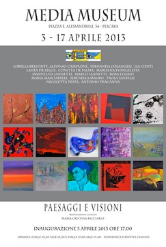 PESCARA – Mercoledì 3 aprile alle ore 17,00 al Mediamuseum, Museo Nazionale del Cinema e dell’Audiovisivo in Piazza Alessandrini, 34 a Pescara sarà inaugurata la Mostra di Pittura, Scultura e Fotografia:Paesaggi e Visioni,presentata dalla dott.ssa Maria Cristina Ricciardi.