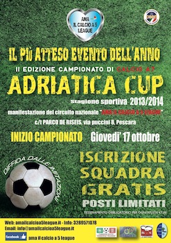 PESCARA – Sono aperte le iscrizioni per la 2a edizione del campionato 2013/14 “ADRIATICA CUP” che si svolgerà presso il Parco De Riseis, via Puccini 8 Pescara, con inizio giovedì 17 ottobre. L’ISCRIZIONE E’ GRATIS, prevede solo il costo del tesseramento per ogni atleta di 7 euro, si giocherà ogni giovedì sera. Il campionato è inserito nel circuito regionale AMA IL CALCIO A 5 LEAGUE che prevede nella stagione sportiva 2013/14 ben 4 campionati amatoriali di calcio a 5 & a 7 in altrettanti impianti diversi.