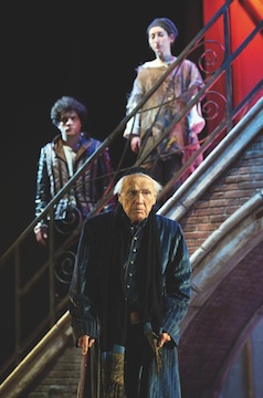 L’attore e regista toscano,che sarà Shylock nel capolavoro shakespeareano,giganteggia nella commedia in cui i temi del denaro, della religione, del potere si intrecciano alle vicende amorose di tre ragazzi. L’attore interpreta il ricco cinico ebreo che presta tremila ducati al mercante, a condizione di riaverli entro tre mesi pena la consegna di una libbra di carne viva. Il mercante Antonio è impersonato da Franco Castellano. L’opera, nella versione del regista Giancarlo Marinelli, ruota intorno alla figura dell’ebreo Shylock, avido, meschino da un lato, ma dall’altro solo e abbandonato anche dalla figlia. Albertazzi è freddo e spietato, caparbio nella prima parte dell’opera, assetato di riscatto verso una città che lo tiene ai margini e diviene fragile poi, quasi indifeso, vessato dalla comunità cristiana.