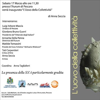 PESCARA – Il 17 marzo prossimo, alle ore 11.30,presso la Sala Michetti dell’Aurum, Luigi Albore Mascia sindaco di Pescara, Giordano Bruno Guerri presidente del Vittoriale degli Italiani, Annarita della Penna direttrice dell’Aurum, Toti Carpentieri critico d’arte, Matilde Tomassini preside del Liceo Artistico Bellisario Misticoni e l’artista Anna Seccia con il coordinamento di Anna Tagliaferri presenteranno alla città l’installazione pittoscultorea “l’uovo della collettività” ideata da Anna Seccia per i 150 anni dell’Unità d’Italia.