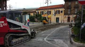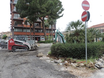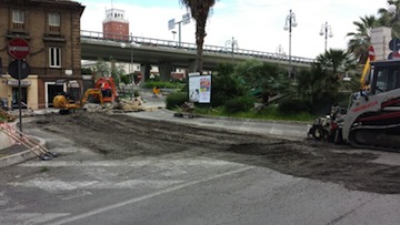 raggiungere la rotatoria all’incrocio tra via Vespucci-via Da Vestea-via Marconi, ed eseguire un’inversione a ‘U’ per dirigersi verso nord. In altre parole elimineremo quell’obbligo di svolta, rendendo permeabile quel punto di incrocio. Il progetto redatto ha consentito di prevedere un nuovo disegno della piazza che sarà consono alle caratteristiche storiche del sito. L’intervento prevede infatti la rimozione di parte della pavimentazione esistente e l’ampliamento della piazza verso est, inglobando nella piazza il Monumento ai Caduti esistente. Nello studio della pavimentazione sono stati recepiti i suggerimenti della Sovrintendenza, inserendo addirittura la sagoma a terra di una parte della Fortezza Borbonica, a ferro di cavallo, oggi non più esistente, come memoria storica ed elemento unificante della tessitura della pavimentazione esistente con quella di progetto. Per il posizionamento della sagoma si è fatto riferimento alle piante di fine ‘800, indicate dall’Università degli Studi ‘D’Annunzio’, Dipartimento di Architettura. L’ampliamento verrà realizzato utilizzando gli stessi materiali della parte già realizzata, ossia cubetti di porfido tessuti a coda di pavone riquadrati in fasce di travertino e inserti in piastrelle di porfido, mentre la sagoma del fabbricato storico demolito, sarà definita attraverso una fascia in travertino profonda 1,70 metri, e al suo interno verrà realizzato un pavimento in cubetti di porfido. I lavori sono stati aggiudicati all’impresa Di Prospero che, su un importo a base d’asta di 310mila euro, ha vinto la gara d’appalto per la somma di 256mila euro. Le opere sono partite stamani con la demolizione della sovrastruttura stradale e di alcuni tratti di marciapiede: dalle 6.30 le ruspe hanno iniziato a lavorare sulla frazione est della piazza, lasciando aperta la corsia di marcia di uscita dall’asse attrezzato. L’intervento prevede anche il rifacimento dell’impianto di pubblica illuminazione e delle condotte di raccolta delle acque bianche, con i relativi pozzetti e caditoie, oltre che dell’arredo urbano e della segnaletica. Inoltre sarà eseguita una riduzione della sede stradale di via dei Bastioni nel tratto prospiciente la piazza e il rialzamento della stessa a quota del marciapiede esistente, creando visivamente uno spazio unitario, anche con la prosecuzione della tessitura della pavimentazione della piazza. Lo spazio veicolare sarà separato da quello pedonale da dissuasori in ferro, simili a quelli già esistenti lungo i bordi della piazza e parallelamente a via dei Bastioni. Infine in prossimità di tutti gli attraversamenti pedonali, saranno realizzate rampe con pendenza non superiore all’8 per cento per permettere l’attraversamento della sede stradale ai diversamente abili”.