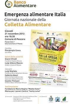 Nel corso del dibattito si parlerà dell’emergenza che verrà a crearsi nel 2014 per il venir meno del programma di aiuti alimentari dell’Unione Europea: dall’anno prossimo potrebbe dimezzarsi il cibo che la Rete Banco Alimentare dona a 1.800.000 poveri, di cui oltre 38 mila quelli abruzzesi, mediante una rete di enti convenzionati. La Giornata Nazionale della Colletta Alimentare del prossimo 30 novembre, così, rappresenta la prima, grande occasione di carità per contribuire a tamponare questa situazione, e mai come quest’anno assume un significato e un valore del tutto particolare.Al convegno, moderato dal giornalista Piergiorgio Greco, porteranno i loro saluti Gianni Chiodi, presidente Regione Abruzzo, e Luigi Albore Mascia, sindaco di Pescara, e interverranno Luigi Nigliato, presidente del Banco Alimentare dell’Abruzzo, Federico Bassi, referente nazionale della Giornata Nazionale della Colletta Alimentare, e Cosimo Trivisani, direttore del Banco Alimentare dell’Abruzzo. Sono previste le testimonianze della Fondazione Maria Regina “Madre Ester” (Scerne di Pineto) e della Mensa per i poveri Centro “Santa Luisa” (Chieti), due enti convenzionati con il Banco, da sempre in prima linea nella lotta alla povertà.