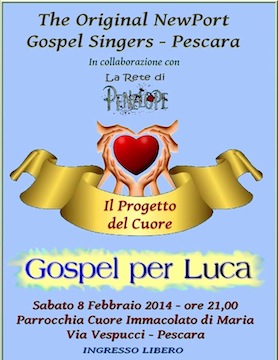 PESCARA – Sabato 8 febbraio 2014 a Pescara, alle ore 21.00, presso il Santuario del Cuore Immacolato di Maria in viale Vespucci 45, avrà luogo il concerto dei The Original Newport Gospel Singers coro composto da circa 40 elementi che uniscono le loro voci per il Progetto del Cuore 2014 – “Gospel per Luca”.
