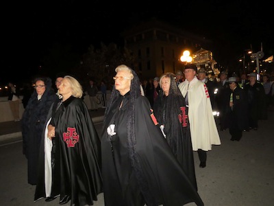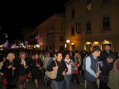 Ma a seguire la statua del Santo, portata a spalla dagli scout con la scorta dei Carabinieri in alta uniforme, sono state, come ogni anno, oltre un migliaio di persone riunite in un silenzioso raccoglimento, scandito solo dalla preghiera. Il corteo religioso, guidato dallo stesso Arcivescovo Valentinetti, lasciata la cattedrale, ha attraversato via Gabriele D’Annunzio, il Ponte D’Annunzio, per poi snodarsi lungo via Caduta del Forte, corso Vittorio Emanuele, il Ponte Risorgimento, con la tradizionale sosta e benedizione al fiume, e quindi ha ripreso il proprio cammino in via Marconi, via Conte di Ruvo e di nuovo via Gabriele D’Annunzio con rientro in cattedrale tra due ali di folla.