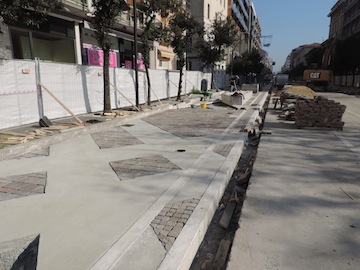 Iniziata ieri la posa in opera dei cubetti di porfido sulla carreggiata lato mare.Raddoppiato il numero degli operai impegnati
