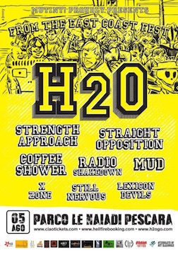 PESCARA – Inserito tra importanti festival del circuito Hardcore internazionale, il From The East Coast Fest presenta un’icona della scena hardcore americana, gli H2O: il quintetto newyorchese, attivo dal 1994, ha diviso il palco con leggende del genere come i Rancid, i Social Distortion, i Misfits e i Pennywise. Gli H2O approdano a Pescara grazie al collettivo Mutiny!, in collaborazione con Hellfire Booking.
