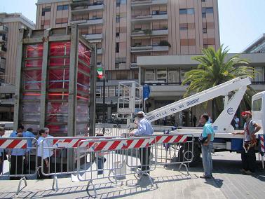Alla lettera del Presidente Centorame ho risposto subito ufficializzando la posizione dell’amministrazione, ovvero l’interesse per tale proposta che si giustifica anche perché il Comune di Pescara è socio e tra i fondatori della stessa Fondazione del MuMi. Lo scorso 15 febbraio – ha proseguito il sindaco Albore Mascia – abbiamo convocato attorno a un Tavolo tutti gli Enti e le Istituzioni interessate dal procedimento per cominciare a fissare paletti e punti fermi. Come ha disposto il giudice, le operazioni di spostamento dovranno essere effettuate dal Comune che ne sosterrà i costi, affidando l’intervento di trasferimento alla Clax Italia. Ma preliminarmente il perito incaricato dal Tribunale, l’architetto Lucarelli, dovrà eseguire dei rilievi sul manufatto per verificarne lo stato prima e, quindi, dopo il trasferimento. Il primo problema da affrontare è però l’enorme peso della struttura, 24 tonnellate concentrate in pochi metri quadrati, dunque nella nuova collocazione andrà prevista la costruzione di un basamento e dovremo soprattutto verificare che non ci siano condizioni di eventuale pericolo per il monumento, ad esempio che il basamento non sia cavo e che nel sottosuolo non ci siano vuoti. In questo senso abbiamo già il progetto del basamento fornito all’epoca dallo stesso Toyo Ito. Stamane come avevamo concordato, l’amministrazione ha effettuato due sopralluoghi per verificare due possibilità di nuova collocazione: il possibile trasferimento della struttura nell’area del Teatro d’Annunzio risulta assolutamente fattibile, considerando la presenza di diversi spazi utilizzabili allo scopo, tutti parimenti dignitosi e adeguati all’importanza dello Huge Wineglass; in seconda istanza abbiamo tentato di valutare anche l’area del Museo ‘Vittoria Colonna’, ma tale ipotesi sembra destinata a sfumare per l’assenza di spazi adeguati. Ora resta come terza ipotesi il Museo Michetti a Francavilla al Mare, anche se sulle varie tesi, che riporteremo all’esame del Tavolo tecnico, sentiremo il parere della città.