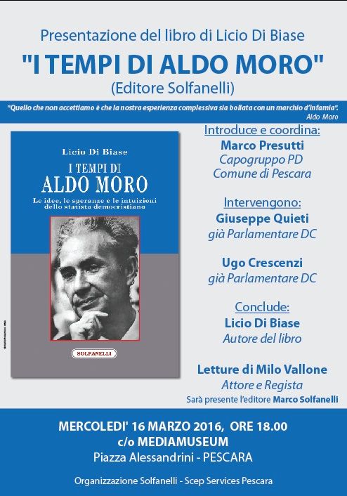PESCARA – Nel giorno dell’anniversario del rapimento di Aldo Moro ,nella Sala Consiliare del Comune di Pescara,giovedì 16 marzo ,alle ore 16.30 si terrà la presentazione del libro di Licio Di Biase “I Tempi di Aldo Moro”.