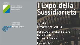 PESCARA – Domani,30 ottobre 2013 alle ore 11.30 presso la sala Azzurra della Regione Abruzzo, in viale Bovio, a Pescara si terrà la conferenza stampa di presentazione del I°Expo della Sussidiarietà,evento promosso dalla Compagnia delle Opere Abruzzo Molise e Regione Abruzzo Direzione Riforme Istituzionali, Enti Locali, Bilancio e Attività Sportive, in programma dal 5 al 7 novembre al Centro espositivo Padiglione Ex Cofa del Porto Turistico di Pescara, articolato in: