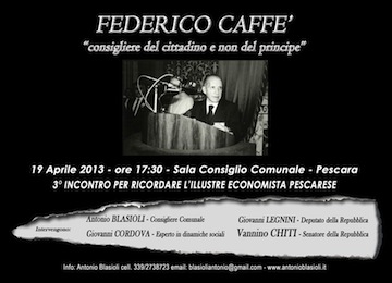 Nell’attuale momento di crisi che trae origine dalla lunga ed indiscussa egemonia liberista ricorre il 26° anniversario della scomparsa di Federico Caffè, illustre economista e figlio dimenticato della città di Pescara.Il 19 aprile alle 17.30 presso l’aula consiliare del Comune di Pescara ricorderemo Federico Caffè e sarà l’occasione non solo di una commossa memoria per la sua vicenda umana che è legata alla scomparsa dell’individuo, ma anche l’occasione per riscoprire la sua persona in questo tremendo momento di crisi, la lucidità dell’analisi economica del Prof. Caffè, congiuntamente alla coerenza del suo impegno civile. Caffè si voleva sentire vivo, lo scriveva ripetutamente in alcune lettere. Non amava sentirsi considerare un monumento. Nella notte del 15 aprile del 1987 esce di casa e lascia sul comodino della propria abitazione le chiavi, il passaporto e i suoi occhiali.
