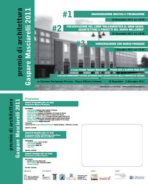 I locali ospiteranno parallelamente la mostra dei progetti di altri due Premi di Architettura: il Premio Archiprix Italia 2010, promosso dal Consiglio Nazionale degli Architetti e rivolto alle migliori tesi di laurea nel campo dell’architettura, dell’urbanistica, dell’architettura del paesaggio e del restauro architettonico, e il Premio Ad’A, a cura della CARSA e dell’Agenzia per l’Architettura d’Abruzzo, riconosciuto alle migliori opere realizzate tra il 2000 e il 2010 nella Regione Abruzzo.L’inaugurazione della Mostra ,avvenuta il 18 novembre ,è stata caratterizzata dalla presentazione del catalogo dedicato al Premio di Architettura “Gaspare Masciarelli” 2011 e dalla premiazione dei vincitori alla presenza del Presidente della Provincia di Pescara Guerino Testa, del Sindaco di Pescara Luigi Albore Mascia, dell’Assessore all’Urbanistica del Comune di Pescara Marcello Antonelli, della sorella dell’Architetto Gaspare Masciarelli, del Presidente del CNAPPC Leopoldo Freyrie, del Presidente della Federazione degli Ordini degli Architetti PPC delle regioni Abruzzo e Molise Mauro Latini, del Presidente dell’Ordine degli Architetti della Provincia di Pescara Massimo Palladini.